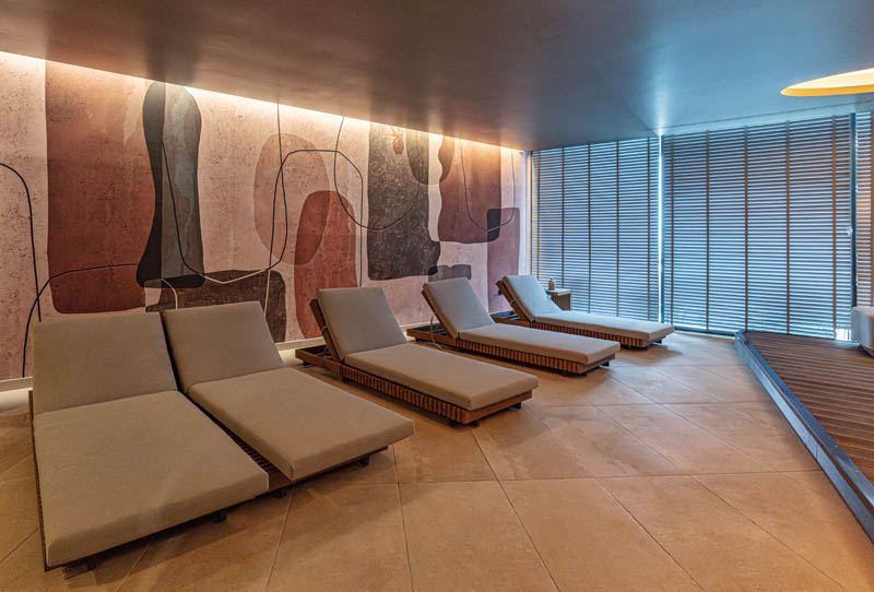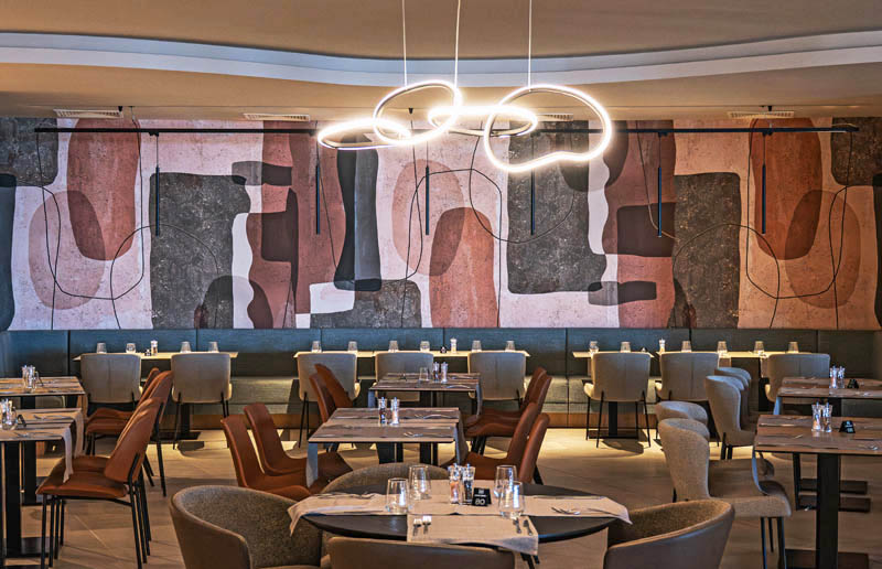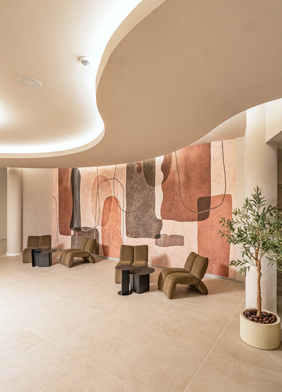 Primordial Forms anchors the spa, lounge, and restaurant zones with layered mineral tones; rust, black, and neutral clay. Its organic geometry and softened texture give rhythm to high-traffic areas without overwhelming them.