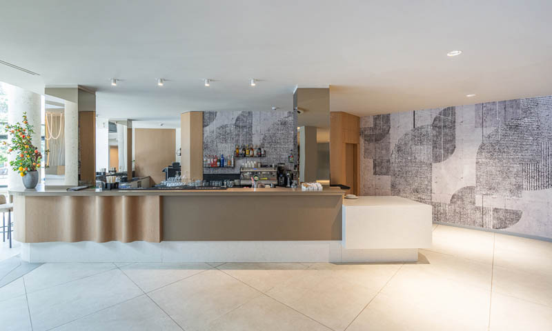 Neo Metropolis III – Light brings the bar area into focus. A softened city grid in monochrome, graphic, but not loud. It adds a layer of quiet modernism to an otherwise fluid interior.