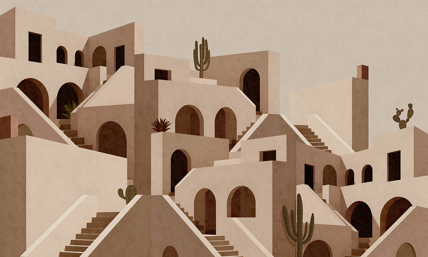 Bov draws inspiration from sun-washed architecture and quiet desert landscapes. Layered structures rise and recede, creating a composition built on geometry, shadow, and balance. Arched openings and stepped volumes guide the eye upward, forming a rhythm that feels both structured and effortless.