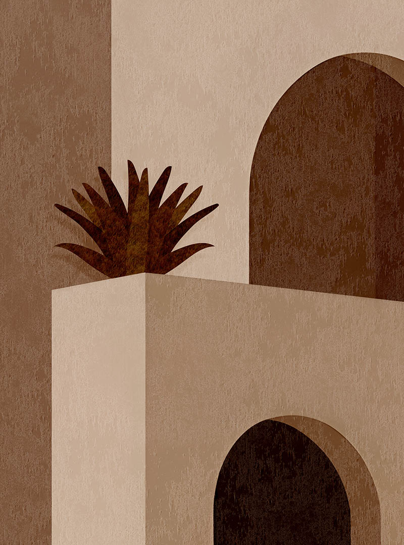 The palette is warm and grounded. Soft sand, clay, and terracotta tones blend into textured surfaces that echo natural plaster and stone. Subtle variations in tone give depth to each plane, allowing light to interact gently across the mural. The result is a surface that feels architectural rather than decorative.