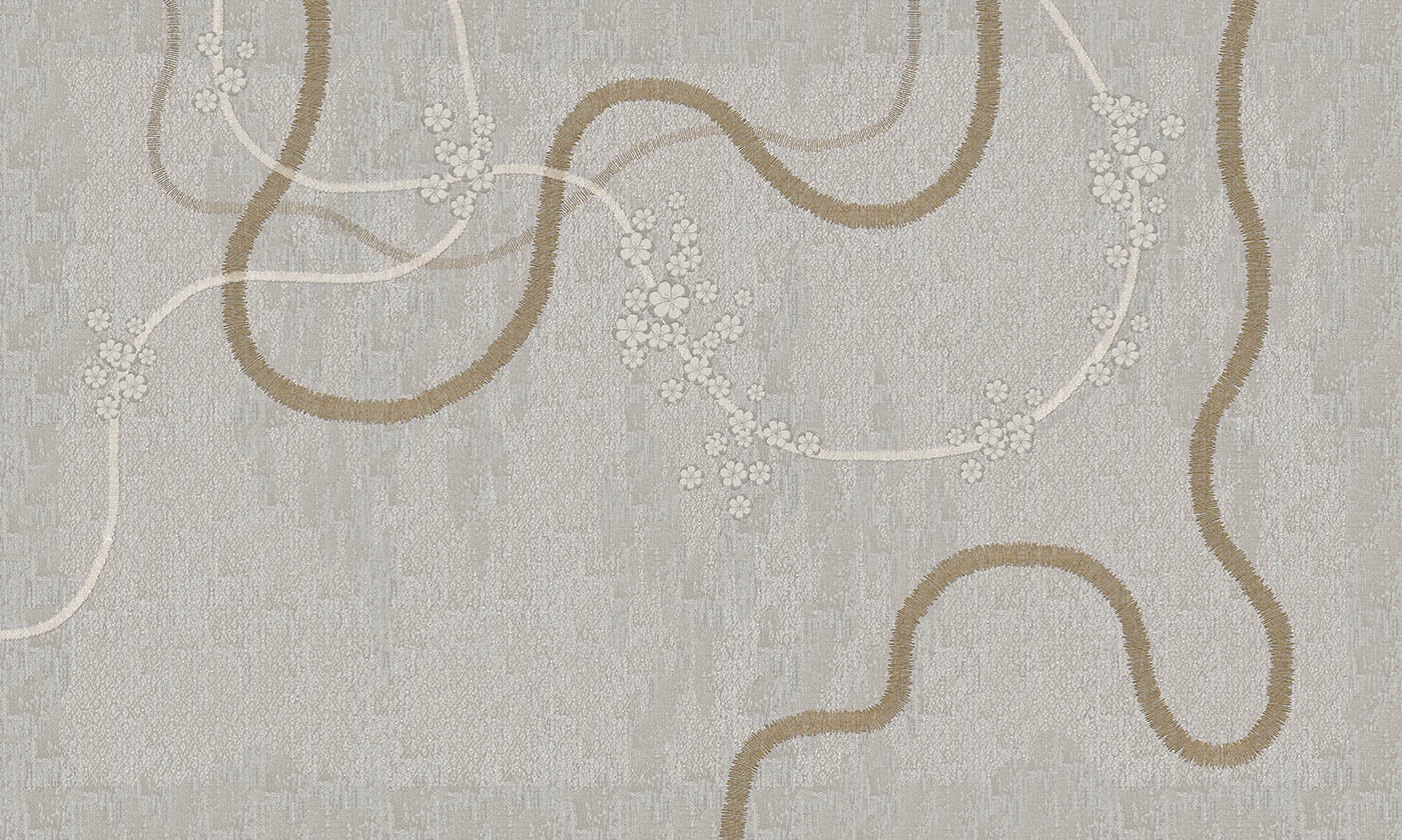 Haru II flows across the wall in gentle, continuous lines, punctuated by small floral motifs that feel almost stitched into the surface. The composition moves horizontally, creating a sense of calm progression rather than repetition. The palette stays restrained, built on warm greys, muted stone, and soft mineral tones. Subtle variations in texture give the surface depth, while the curved lines bring a quiet rhythm that feels natural and unforced. Up close, the detailing reveals a fabric-like quality. From a distance, the mural reads light, balanced, and serene.
