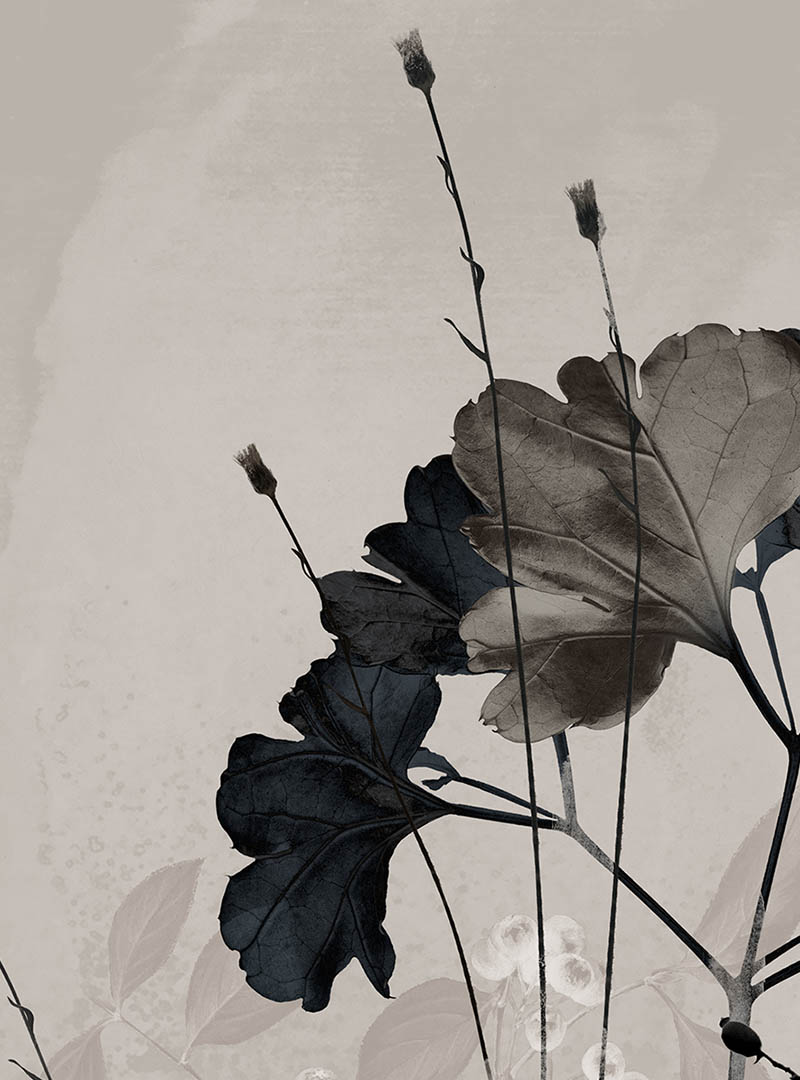 Herbarium draws its presence from contrast. Delicate botanical forms rise against a soft, mineral background, their silhouettes darkened and restrained, as if preserved between layers of time and plaster. The composition feels light but grounded. Fine stems and branches stretch upward, while broad leaves anchor the design, creating a balanced vertical movement that never overwhelms the room. Subtle washes and tonal variations soften the surface, giving the mural depth without sharp edges or visual tension.