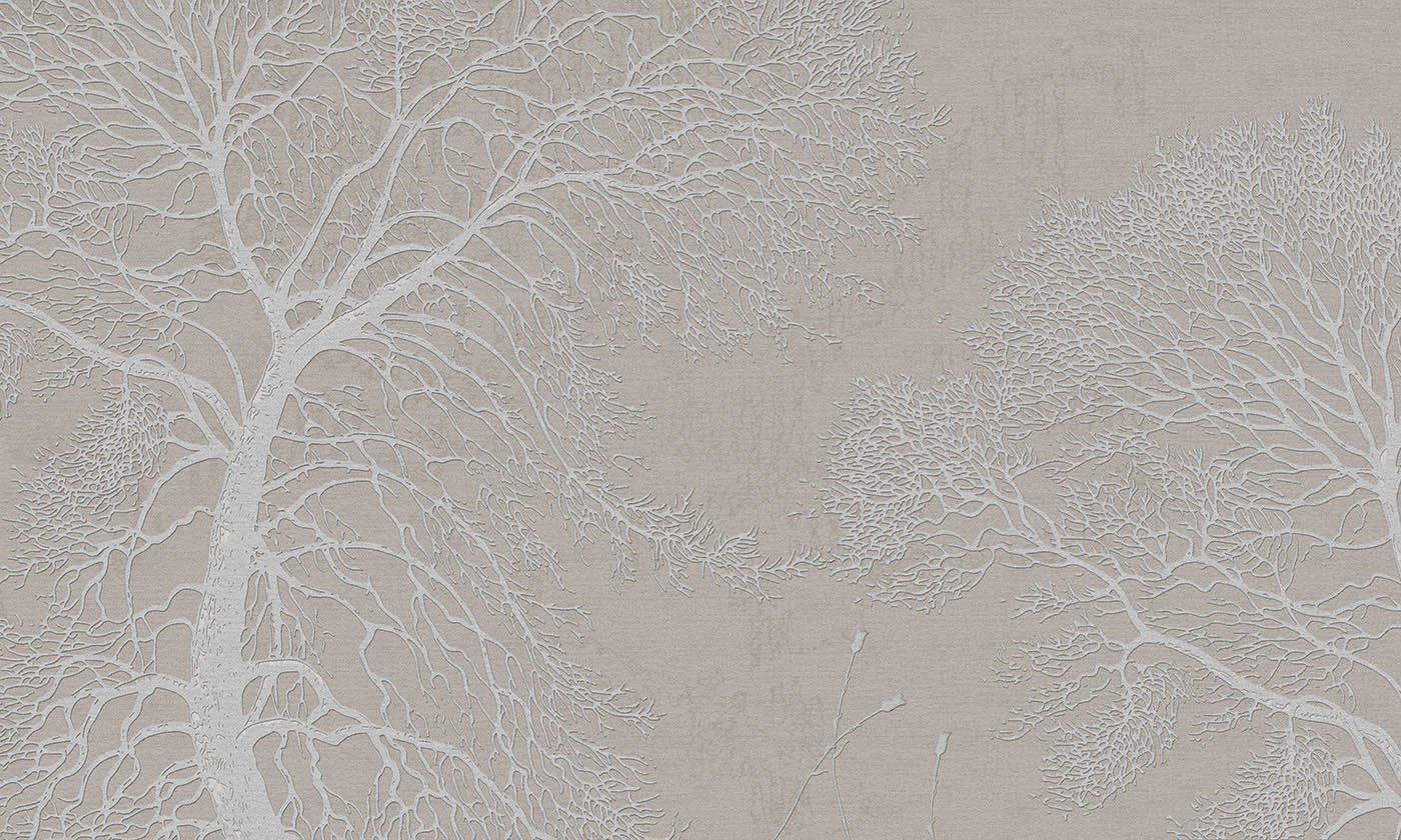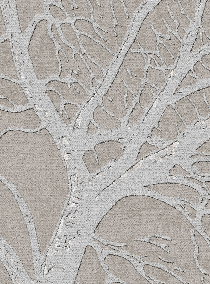 The palette is pale and tonal. Warm ivory, soft linen, and chalky whites blend seamlessly into one another, creating a surface that feels luminous rather than flat. The raised tree forms catch light throughout the day, shifting subtly with the room’s atmosphere. There is a tactile quality here, refined and almost sculptural, adding depth without heaviness.